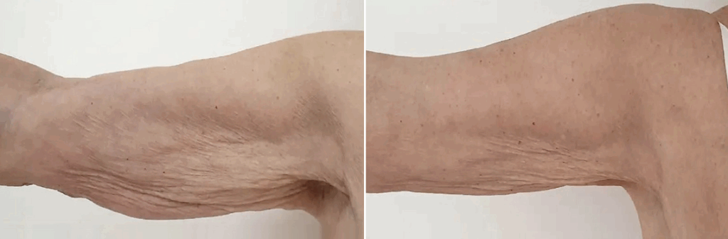 První efekt je viditelný ihned – paže působí pevněji a konturovaněji. Plný výsledek se rozvíjí v průběhu 2–3 měsíců díky novotvorbě kolagenu.